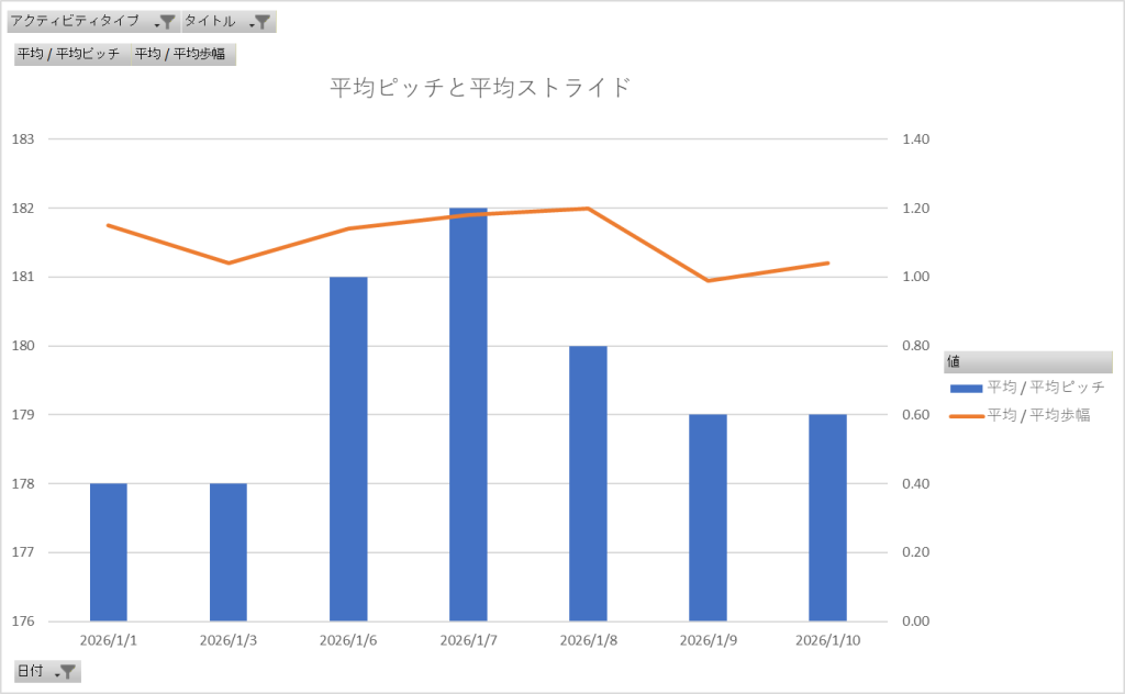1/7は1000m*3本のインターバル走なので平均ピッチが速いですね。補足すると、1/7と1/9はレストを含めての計算になっているので、最大で算出するとより正確なグラフになるかもしれません。