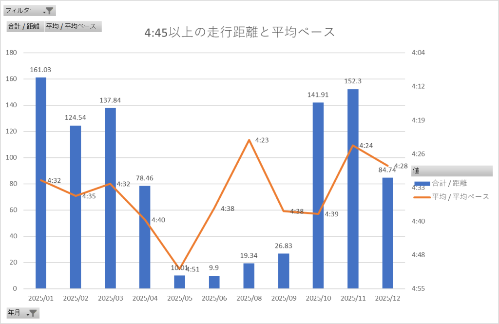 4:45/km以上で走った走行距離と平均ペースをまとめました。