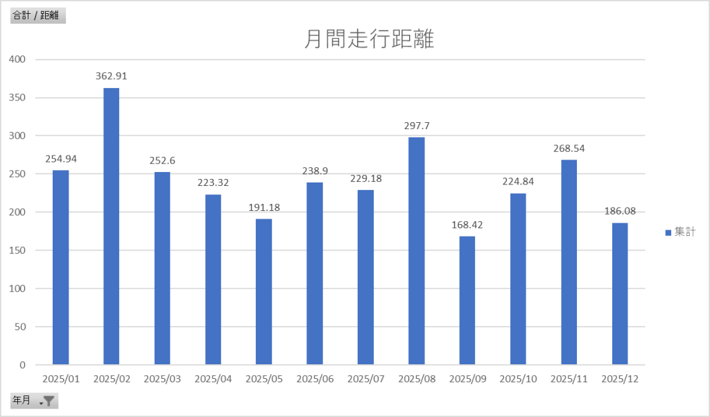 2025年の月間走行距離をまとめました。もしかしたら明日走るかもしれませんが、10km程度なので誤差としておきましょう笑。